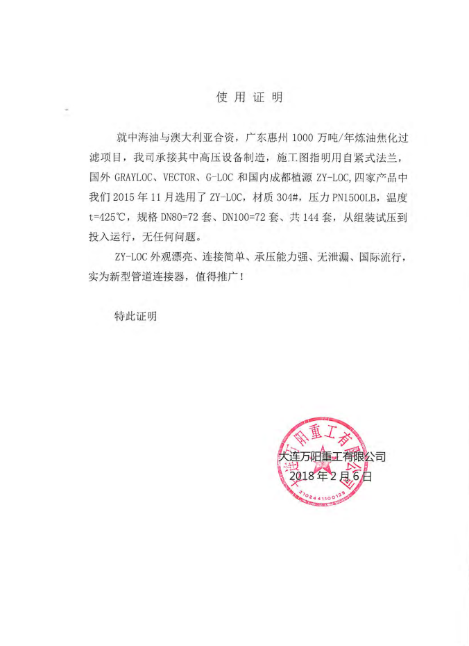 大連萬(wàn)陽(yáng)重工有限公司使用證明