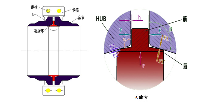 e)F、F1、F2直接作用,沒(méi)有傳統法蘭存在的力臂H,故而沒(méi)有力矩M,使其體積大大減小。第一次機械外力F:是由螺栓擰緊引起第二次機械外力:是由管道內壓P引起