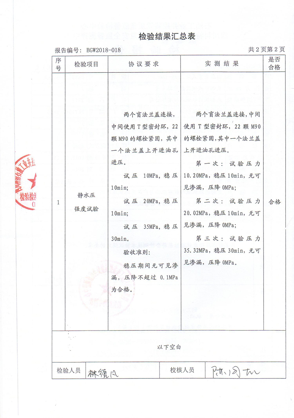 2018年1月15日,受成都植源機械科技有限公司委托,“井控中心”對DN900非卡套式高壓自緊式法蘭ZY-LOC,進(jìn)行了專(zhuān)業(yè)檢測,檢驗要求為:壓力35MPa(設計壓力20MPa),穩壓30分鐘。從升壓開(kāi)始至10MPa,穩壓10分鐘,再次升壓至20MPa,穩壓10分鐘,最后升壓至35MPa,穩壓30分鐘,整個(gè)檢驗過(guò)程受檢產(chǎn)品紋絲不漏,“井控中心”給出結論:無(wú)可見(jiàn)滲漏,壓降0MPa,到現場(chǎng)進(jìn)行產(chǎn)品檢驗的專(zhuān)家,也被監控傳感器反饋至電腦上的數據所折服,專(zhuān)家們說(shuō),這么大的口徑,這么高的壓力,0.3MPa的壓降在國內都屬于非常高的標準了,但是ZY-LOC居然做到了0壓降,不可思議!這么先進(jìn)的產(chǎn)品應該得到國家、各行業(yè)的重視,并大力推廣應用。